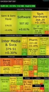 Esta imagen es un mapa de calor del índice S&P 500 del 4 de junio de 2024, que muestra el rendimiento de diferentes sectores del mercado de valores.